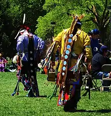 The Straight Dance is considered to be more dignified or formal than other pow wow dances.[3][4] The general steps for the dance involve a "toe-heel" step where the dancer taps the ground with his toe on the first drum beat and then places his whole foot down on the second beat. The dance resembles a hunting or warring party and therefore the dancer must not dance backwards as that would symbolize a retreat from the enemy.[5] Instead they always dance clockwise around the circle. As a Southern dance, it is danced to a Southern Drum.[6]