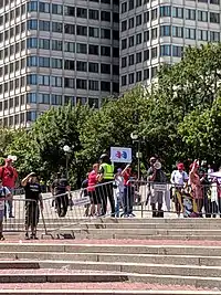 The group Super Happy Fun America (SHFA) organized an August 31 "Straight Pride Parade"[44] that attracted several hundred participants and thousands of protesters.[45] Counter-protesters vastly outnumbered attendees of the parade.[46][47] SHFA called the event "a response to the 'identity politics' of the left."[44] Emerson College's president M. Lee Pelton warned about the event, as the parade route, starting at Copley Square and ending at Boston City Hall, borders the college campus. He said the event represents "fear and ignorance, humanity's most potent cocktail, masquerading as freedom of speech"[44] in response to which SHFA organizer Samson Racioppi asked for a retraction and apology.[44] The SHFA group was created in 2017 by Kyle Chapman, who founded the group Fraternal Order of the Alt-Knights a week after the Charlottesville Unite the Right riot.[48] Staff include president John Hugo, former Republican Congressional candidate; and vice president Mark Sahady, "a member of the right-wing group Resist Marxism, who has organized several right-wing demonstrations in the past."[44] SHFA announced the event in June 2019. Racioppi, Sahady, and Hugo contacted the police in early July 2019 when envelopes filled with glitter were mailed to them.[49] One of the event's attendees, Marky Hutt, previously founded a group for gay Trump supporters; he said the organizers of the Straight Pride event had invited him to attend, and he was present at the event with his fiancé.[45]