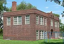 The building is constructed in a rectangular shape, symmetrical on the exterior, and measures 32 feet (9.8 m) by 66 feet (20 m). The approximate height measurements are not provided by the Register. Large, six over six paned windows are located in the front and the back of the building on both floors. Similar windows are also located on the south side of the building, but only on the top floor. There are no windows located on the north side. The entire exterior of the building is constructed from brick. The roof is flat and constructed of roofing cement, with a parapet located around it, with a section of a chimney that sticks out of the south end of the roof. The most prominent feature of the exterior of the building is the large, central pavilion, with a stepped gable parapet wall.[1]