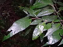 The leaves are thin with a long pointed tip. 5 to 8 cm (2 to 3+14 in) long, alternate and simple. Usually finely toothed. The underside of the leaf is hairy, the top is glossy and mid green in colour. Leaf venation is more evident on the undersurface. Unlike in other species, the lateral veins do not terminate in leaf serrations.