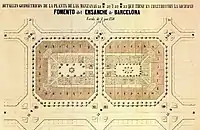 Thanks to the demolition of the medieval walls in 1854, the city was able to expand on the adjacent plain.[71] In 1859 the City Council appointed a commission to promote a competition for enlargement (eixample) projects, which was won by Antoni Rovira i Trias; however, the Ministry of Development intervened and imposed the project of Ildefonso Cerdá, author of a topographical plan of the Barcelona plain and a demographic and urbanistic study of the city (1855). The Cerdá Plan (Plan de los alrededores de la ciudad de Barcelona y del proyecto para su mejora y ampliación, 1859) instituted an orthogonal layout between Montjuïc and the Besós river, with a system of rectilinear streets oriented northwest-southeast, 20 m wide, cut by others oriented southwest-northeast parallel to the coast and the Collserola mountain range. Thus a series of square blocks of 113.3 m on each side were delimited, of which Cerdá planned to build only two sides and leave the other spaces for gardens, although this point was not fulfilled and finally practically all the buildable land was used; the buildings were designed with an octagonal floor plan characteristic of the Eixample, with chamfers that favored circulation.[72]
