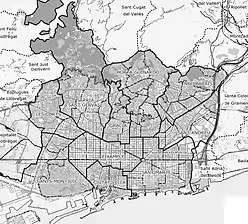 In 1984 the current division into ten districts was approved, established with the aim of decentralizing the City Council, transferring competencies to the new consistories. The new districts were established with the maximum respect for their historical and morphological identity, but also seeking a practical and functional delimitation, which would guarantee the neighbors a wide welfare coverage. In general, an effort was made to respect the old demarcations from the old city, its expansion and the aggregated municipalities, although some areas varied with respect to their historical belonging: Pedralbes, previously belonging to Sarriá, became part of Les Corts; Vallcarca, formerly part of Horta, was incorporated into Gracia; El Guinardó, originally from San Martín, was added to Horta; and the new district of Nou Barris was segregated from San Andrés.[25]