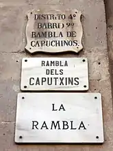 Between 1776 and 1778 the urbanization of la Rambla was carried out, an ancient torrent that during the Middle Ages marked the western boundary of the city, which had been populated since the 16th century, mainly by theaters and convents. At this time the inner wall was demolished, the buildings were realigned and a new landscaped promenade was designed, in the style of the French boulevard.[52] La Rambla has different names for each of its sections, so it is also often referred to in the plural, Las Ramblas. From the Plaza de Cataluña to the Portal de la Paz, it is called: Rambla de Canaletas, after the water pipes of the San Severo reservoir; de los Estudios, after the old university or Estudi General; de San José, after the Carmelite convent of San José, located on the present site of the Boquería market; de los Capuchinos, after the convent of the Capuchins of Santa Madrona, which was in the area of the present Plaza Real; and de Santa Mónica, after the church of the same name. The term rambla comes from the Arabic ramla (رملة), which means "sandbank" — or intermittent watercourse — and has since been used as a generic for numerous thoroughfares in the city: Badal, Brasil, Cazador, Carmelo, Cataluña, Fabra i Puig, Guipúzcoa, Mar, Once de Septiembre, Pueblo Nuevo, Prat, Prim, Raval and Volart.[53]