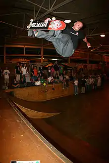Mike Vallely performing a head-high frontside air at a demo at Doc*36 Skatepark in Jackson, Mississippi