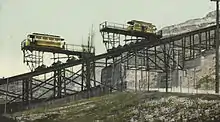 The streetcars were used in conjunction with four of Cincinnati's inclined railways, the Mount Adams Incline, Mount Auburn Incline, Bellevue Incline, and Fairview Incline.[4] Except for the Fairview Incline, these originally conveyed horsecars, but were later equipped to carry electric streetcars. The cars would be driven onto the incline platform, which was level and was equipped with rails and (in most cases) overhead trolley wires. The platform, riding on its own rails, would then be pulled up the hill by the cable, carrying the streetcar. Once reaching the top, the streetcar could simply be driven off of the platform, onto the fixed-in-place track along city streets.[4] The 1872-opened Mount Adams Incline began carrying horsecars in 1877, and it was later strengthened for use by electric streetcars, which were much heavier.[8]