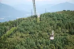 The Stresa–Alpino–Mottarone Cable Car is an aerial tramway, a form of cable line in which cabins are suspended from a fixed cable and hauled by a separate traction cable to which they are permanently attached, with cabins shuttling backwards and forwards instead of running in a continuous loop. The Stresa–Mottarone line had two separate sections, each with two cabins, and passengers change cabin at the mid-point station of Alpino, between the Stresa and Mottarone stations.[5][6]