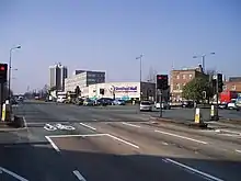Because Stretford is situated on the main A56 road between Chester and Manchester many travellers passed through the village, and as this traffic increased, more inns were built to provide travellers with stopping places. One of the earliest forms of public transport through Stretford was the stagecoach; the Angel Hotel, on the present day site of what used to be the Bass Drum public house,[33] was one of the main stopping places for stagecoaches in Stretford, and the Trafford Arms was another.[34] Horse-drawn omnibuses replaced the stagecoach service through Stretford in 1845.[35] The Manchester Carriage Company's tramway from Manchester to Stretford was built in 1879, terminating at the Old Cock Hotel on the A56 road, next to which a small depot was built to house the cars and horses.[36] A 1900 timetable shows that trams left for Manchester every 10 minutes between 8:00 am and 10:15 pm.[37] The horse-drawn trams were replaced with electric trams in 1902,[38] and after the Second World War the trams were replaced by buses.[39]