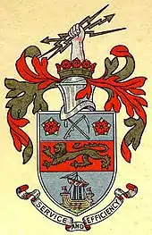 Stretford Urban District became the Municipal Borough of Stretford in 1933,[41] giving it borough status in the United Kingdom. Stretford Borough Council was granted its arms on 20 February 1933. The roses are the red roses of Lancashire, and the lion in the centre represents John of Gaunt, 1st Duke of Lancaster. Above the lion are a crossed flail and scythe; the flail comes from the arms of the de Trafford family; the scythe is a reminder of the agricultural history of the area; the thunderbolts above represent the importance of electricity in Stretford's industrial development. The boat at the bottom represents Stretford's links to the sea via the Manchester Ship Canal.[44]