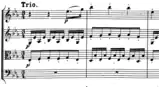 The published third movement is a minuet and trio with the tempo marking of moderato. The minuet is in B-flat major and the trio is in E-flat major. The first violin states the main thematic material of this movement and the other instruments accompany with ostinato figures. While not given large thematic material as in the previous movements, the cello is given the final note of both sections of the trio without any other voice playing.