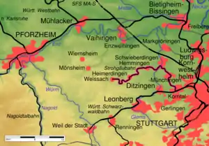 The Strohgäu Railway (German: Strohgäubahn) is a branch line in the Stuttgart region of the German state of Baden-Württemberg. It is single-track and standard gauge, and is 21.9 kilometres (13.6 mi) long. It links Weissach and Hemmingen with Korntal, where a connection is made with line S6 of the Stuttgart S-Bahn, which provides a direct service to Stuttgart.[1]