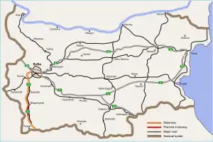 The Struma motorway forms a connection between Sofia and Kulata at the Bulgaria-Greece border with a total planned length of 172.8 km.[2] As of December 2018, about 129.46 km of the motorway, from Sofia to Blagoevgrad, and from Kresna to Kulata have already been completed and are in service.