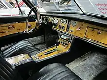 Exner's design included a spare tire that protruded through the trunk lid and freestanding headlamps. The fuel filler cap is positioned inside the spare tire on the first models.[3] The interior includes 24-carat gold plated trim and bird's eye maple or burled walnut and redwood, Connolly leather seats and dash, instrument markings in both English and Italian, fine wool or mink carpeting and headlining, a cigar lighter, and a liquor cabinet in the back. There is a clock in the steering wheel hub on some later models.[4] Other special features include automatic headlamp controls with twilight sensor, cornering lamps, bilevel automatic air conditioning, Superlift air adjustable shock absorbers, Safe-T-Track limited slip differential, an electric sunroof, cruise control, central locking, a burglar alarm, non-functional exhaust side pipes, and a high-end Lear Jet AM/FM eight-track quadraphonic sound system. The first models rolled on special 17-inch Firestone LXX run-flat tires and rims. These were taken off the market however as they turned out to be unsafe.[5]