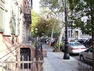 For much of the 18th and 19th centuries, Stuyvesant Street remained an important thoroughfare and market street, but today it is a quaint street with single family homes and apartment buildings, and is often used for movie shoots of "Old New York". All of the north side of Stuyvesant Street, from #21 to #37, and the south side from #42 to 46, are part of the St. Mark's Historic District created in 1969 by the New York City Landmarks Preservation Commission to protect the area around St. Mark's Church.[1] In addition, the Hamilton Fish House at 21 Stuyvesant Street, also known as the Stuyvesant Fish House, is a New York City landmark owned by Cooper Union and occupied by its president.[2]