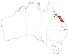 This leucopogon grows in shrubland on hillsides and mountains on the central Queensland coast between Hook Island in the north and Great Keppel Island and Mount Wheeler in the south.[2]