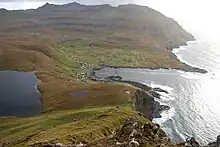 Vágseiði is a place with 200-metre-high (660 ft) cliffs towards south, but the road is down by the sea, the skerries are called Heltnarnar and a cliff on Vágseiði is called Múlatangi.