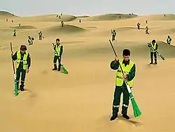 Her breakthrough came in 2003 with Golden Lion she won for her exhibition "Air conditioned" in the Luxembourg pavilion at the Venice Biennial. Her video projection Les balayeurs du désert (The Desert Sweepers) shows street sweepers in their distinctive Paris uniforms pointlessly sweeping away at the desert sand to the soft sound of brooms against asphalt. The second major work "The Echo", also a video, depicts an Alpine scene in which a tiny figure plays the cello, the simple sounds of the instrument being reflected by the mountains. These and the other components of the exhibition were in fact a play on the "ɛ:r" sound in air conditionné denoting the concepts of ère (era), aire (area), air (air and tune).[1][3]