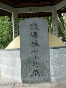 Su Xiaoxiao's tomb was destroyed during the Cultural Revolution, but it was rebuilt in 2004, complete with a brand new pavilion decorated with twelve poetry posts handwritten by famous calligraphers. The current tomb is empty.[6] Su Xiaoxiao's tomb is now again a major tourist site in Hangzhou. Since the pavilion the tomb is hosted under is named Mucaiting, which could be misread phonetically as Mocaiting (touch for wealth), many tourist walk by would purposefully touch or throw coins on the tomb for hope of wealth and prosperity.[7] Su Xiaoxiao is also the heroine of TV series Loving Courtesan Su Xiaoxiao.