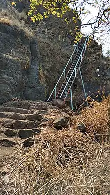 The fort has steep cliffs on all the sides. It is a very small fort, with fortification over an area of 1–2 acres. There are many rock cut water cisterns on the fort. Only two cisterns have clear potable water. There is a cave on the fort with Shivalinga. From the top of fort Mahipatgad, Rasalgad, Chakdev and Parvatgad are seen.[2]