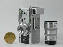 A subminiature camera is a class of camera that is very much smaller than a "miniature camera". The term "miniature camera" was originally used to describe cameras using the 35 mm cine film as negative material for still photography;[1] so cameras that used film smaller than 35mm were referred to as "sub-miniature".[2][3][4]: 11 The smallest of these are often referred to as "ultra-miniature". Lipstick cameras and other small digital cameras are not included, because they don't use film. The smaller subminiature cameras, called ultraminiature cameras, particularly Minox, are associated with spying.