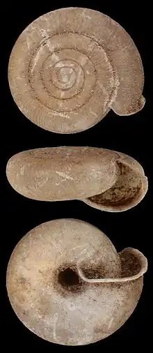 | Apical, apertural and umbilical view of a shell of Suboestophora hispanica. | |