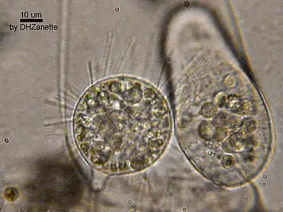 Suctoria are ciliates that become sessile in their developed stage and then lose their redundant cilia. They feed by extracellular digestion.[1] They were originally thought to feed by suction – hence their name.[2] In fact, they use specialized microtubules to ensnare and manipulate their prey.[2] They live in both freshwater and marine environments, including some that live on the surface of aquatic animals, and typically feed on other ciliates. Instead of a single cytostome, each cell feeds by means of several specialized tentacles. These are supported by microtubules and phyllae, and have toxic extrusomes called haptocysts at the tip, which they attach to prey. They then suck the prey's cytoplasm directly into a food vacuole inside the cell, where they digest and absorb its contents. Most suctoria are around 15-30 μm in size, with a non-contractile stalk and often a lorica or shell.