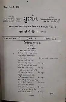 As well as running regular features such as book-reviews, articles on social and political problems and some creative writing, Manilal published three important series of articles in Sudarshan: Abhyas (Practice; December 1894 – September 1898); Purva ane Pashchim (East and West); and Gujaratna Lekhako (Writers of Gujarat). These, according to the writer Dhirubhai Thaker, are the best products of Manilal's reflective and creative faculties.[5] Manilal's last and the most famous poem, Amar Asha, was published in Sudarshan (vol. 14, issue 1), on 1 October 1898, the same day that Manilal died.[3] Kalapi's first poem, Fakiri Hal, was first published in Sudarshan in November 1892 issue.[5][6]