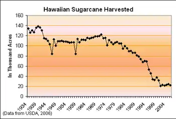 Sugar plantations suffered from many of the same afflictions that manufacturing market segments in the United States continue to feel. Labor costs increased significantly when Hawaiʻi became a state and workers were no longer effectively indentured servants. The hierarchical caste system plantation managers sought to maintain began to break down, with greater racial integration of the sugarcane plantations. Workers began to discover they had rights, and in 1920 waged the first multi-cultural strike.[9] Global politics played a large role in the downfall of Hawaiian sugar. Shifting political alliances between 1902 and 1930 permitted Cuba to have a larger share of the United States sugar market, holding 45% of the domestic quota while Hawaiʻi, the Philippines, and Puerto Rico shared 25%.[6]