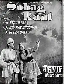 Suhaag Raat (English: Wedding Night) also called Sohag Raat, is a 1948 Hindi film of Indian cinema directed by Kidar Sharma.[1] A romantic drama, it was Oriental Pictures first film, with distribution rights owned by Varma Films. The story was a joint effort by F. A. Mirza and V. Sharma, while the screenplay, dialogue and lyrics were written by Kidar Sharma. The music was composed by Snehal Bhatkar, with cinematography by D. K. Ambre and D. C. Mehta. Geeta Bali made her debut in a lead role with this film, which co-starred Bharat Bhushan and Begum Para.[2] The rest of the cast included Pesi Patel, Nazir Kashmiri, S. Nazir, Nazira and Shanta Kumar.