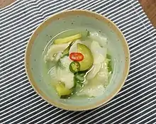 Sujebi[1] (수제비, in S. Korea), ttŭdŏ-guk (뜨더국, in N. Korea), or hand-pulled dough soup,[1] or Korean-style pasta soup, is a Korean traditional soup consisting of dough flakes roughly torn by hand, with various vegetables. The flavor and recipe resemble kalguksu, except that the latter is made with noodles rather than wheat flakes. It is commonly considered a dish to consume on rainy days, along with bindaetteok.