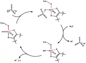 The active site of sulfite oxidase contains the molybdopterin cofactor and supports molybdenum in its highest oxidation state, +6 (MoVI). In the enzyme's oxidized state, molybdenum is coordinated by a cysteine thiolate, the dithiolene group of molybdopterin, and two terminal oxygen atoms (oxos). Upon reacting with sulfite, one oxygen atom is transferred to sulfite to produce sulfate, and the molybdenum center is reduced by two electrons to MoIV. Water then displaces sulfate, and the removal of two protons (H+) and two electrons (e) returns the active site to its original state. A key feature of this oxygen atom transfer enzyme is that the oxygen atom being transferred arises from water, not from dioxygen (O2).