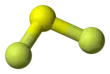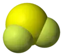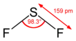 The F−S−F bond angle is 98°, and the length of S−F bond is 159 pm.[1] The compound is highly unstable, dimerising to FSSF3. This unsymmetrical isomer of S2F4 is proposed to arise via insertion of SF2 into the S−F bond of a second molecule SF2:[2]