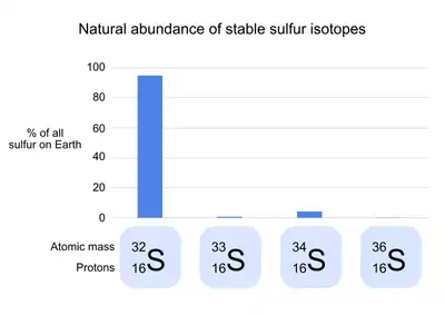 Sulfur has 24 known isotopes,[2] 4 of which are stable (meaning that they do not undergo radioactive decay).[3] 32S, the common isotope of sulfur, makes up 95.0% of the natural sulfur on Earth.[2] In the atomic symbol of 32S, the number 32 refers to the mass of each sulfur atom in daltons, the result of the 16 protons and 16 neutrons of 1 dalton each that make up the sulfur nucleus. The three rare stable isotopes of sulfur are 34S (4.2% of natural sulfur), 33S (0.75%), and 36S (0.015%).[4] These isotopes differ from 32S in the number of neutrons in each atom, but not the number of protons or electrons; as a result, each isotope has a slightly different mass, but has nearly identical chemical properties.[3]