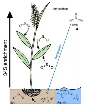 Most vegetation can acquire sulfur from gaseous atmospheric compounds or various ions either in soil solutions or water bodies.[77] Uptake of gaseous and dissolved sulfur compounds apparently occurs with little accompanying isotopic selectivity.[78] Dissolved sulfate (SO42-) is considered to be the central pool which is metabolized by microorganisms and plants as most forms of atmospheric sulfur is oxidized into sulfate. Atmospheric sulfur is eventually returned to the soil when it is scrubbed from the atmosphere during precipitation or through dryfall.[77]