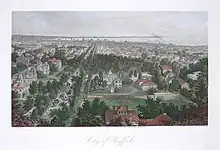 The sudden and unexpected death of General Sullivan A. Meredith occurred in Buffalo, New York, in the evening of Saturday, December 26, 1874.[1] For about a week or ten days he had complained of a pain or troublesome feeling in the region chest, accompanied by some difficulty of respiration, but no apprehension of a serious result was felt, and he was not disabled from attending to business.[1][2] On Saturday morning, after calling upon his physician, the General proceeded to his own office, where he remained as usual until about 2:30 pm, at which time, his wife coming for him with the family carriage, he returned to his residence, 167 10th Street.[1] After partaking of dinner, about 5 pm, he went to pay a visit to one of his neighbors or friends, who was indisposed or sick.[1][2] Going home again at 6:30 pm, he took up the evening paper and read for half an hour, when he laid the paper aside, complaining of a return of the pain from which he had previously suffered.[1][2] He walked out on the verandah for a few moments, and returning seated himself upon a sofa in the library, where, by the bathing of his feet in hot water and the application of mustard paste, some relief was given.[1][2] In the mean time his wife had sent for the family physician, Dr. Kenyon, who, however was not found.[1] After remaining upon the sofa for a short time he suddenly placed his hand upon his breast, in the region of his heart, and said to his wife, "Here's a new sensation!"[1][2] His head immediately drooped, his eyes assumed a set expression, and he breathed his last, without the utterance of another word,[1] at about 7:45 pm.[2] He left a wife and four children, two sons and two daughters, the eldest nine years of age.[2] Until recently be had been a vestryman of St. Luke's Episcopal church.[2]