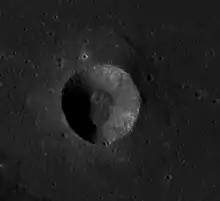 About 10 kilometers to the south and east is the Montes Haemus range that forms the edge of the Serenitatis basin. This crater has a relatively high albedo, with a sharp-edged rim that displays little appearance of wear. There is a small rise at the midpoint. Recent deposits of highland material have been observed within the crater interior. This material was observed to be orange by Apollo 17 astronauts during their LMP ascent.[2]