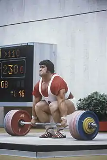 Sultan Saburovych Rakhmanov (Ukrainian: Султан Сабурович Рахманов; 6 July 1950 – 5 May 2003) was an Olympic weightlifter for the USSR who won the gold medal in the super heavyweight class of the 1980 Summer Olympics.[1] Sultan Rakhmanov won the super heavyweight gold medal in 1980 in Moscow when his legendary teammate Vasily Alekseyev was eliminated after he failed three times to snatch 180 kg.[1] Rakhmanov made 6 perfect lifts to score a decisive victory at the 1980 Olympics. He also won gold medals at the World Weightlifting Championships in 1979 and 1980.[1]
