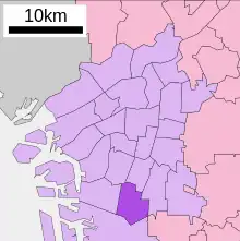 Sumiyoshi-ku (住吉区) is one of 24 wards of Osaka, Japan. It is located on the southern part of the Uemachi Plateau, in the southernmost part of Osaka City, and is separated from Sakai City's Sakai-ku and Kita-ku by the Yamato River. There are six rail lines, and three main thoroughfares - Abiko-Suji (which run north–south through the centre of the ward), Abeno-Suji (which continues north through the area of Tennoji) and Nagai Koen-Dori, which runs east–west and connects the area with the port to the west. The northern part of Sumiyoshi-ku is a residential area which is a continuation of the southern part of Abeno-ku. The Tezukayama 1-Chome neighbourhood in Abeno-ku, and Tezukayama-naka and Tezukayama-nishi neighbourhoods in Sumiyoshi-ku are upper-class residential areas. South of this, around the Sumiyoshi Grand Shrine, are the Sumiyoshi and Kamisumiyoshi neighbourhoods, home to many long established local families. Surrounding these are the middle-class residential neighbourhoods of Shimizugaoka, Suminoe, Oriono, Dairyo, Minamisumiyoshi, Yamanouchi, and Nagai, which lies at the eastern end of the ward. Sumiyoshi-ku is home to about 157,000 residents, and has a population density of 16,800 people per square kilometer.