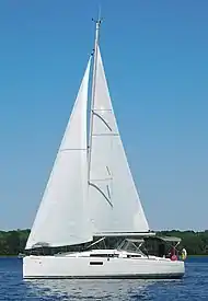 The Sun Odyssey 349 is a recreational keelboat, built predominantly of fiberglass with a hard chine hull. The deck is injection molded with an end-grain balsa core. It has a 9/10 fractional sloop rig with a deck-stepped mast, Technique Voile sails, double aft-swept spreaders, aluminum spars and no backstay. Sail control uses friction rings instead of a mainsheet traveler and a rigid boom vang. It features a plumb stem, a slightly reverse transom with a gas strut assisted, drop-down tailgate-style swimming platform, dual internally mounted spade-type rudders controlled by two wheels and a fixed fin keel, shoal draft wing keel or lifting keel. It can also be equipped with an asymmetrical spinnaker of 1,023 sq ft (95.0 m2).[1][3][4][5][6][8]