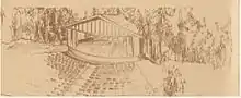 One enthusiastic patron wrote at the time: "Sundance is the newest and brightest star in the Bucks County firmament. The setting is a charming sylvan one, deep in a wooded area. The comfortable seating is, in true theater fashion so that one has an obstructed view from every point. The stage is handsome having a proscenium on which the names of the geniuses of the past and present are carved in gold on a dark brown with background. But the most interesting aspect before one enters the open air seating area and views the stage is that of the Mexican Indian like stucco wall, which forms the background of the theater, and seems to convey the idea of an abstract painting. And there is peace and beauty here – and excitement."[1]