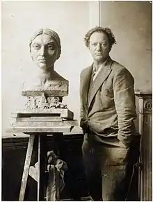 Jacob Epstein with his bust of Sunita, c. 1926.