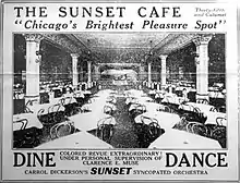 The Sunset Cafe, also known as The Grand Terrace Cafe, was a jazz club in Chicago, Illinois operating during the 1920s, 1930s and 1940s. It was one of the most important jazz clubs in America, especially during the period between 1917 and 1928 when Chicago became a creative capital of jazz innovation and again during the emergence of bebop in the early 1940s. From its inception, the club was a rarity as a haven from segregation, since the Sunset Cafe was an integrated or "Black and Tan" club where African Americans, along with other ethnicities, could mingle freely with white Americans without much fear of reprisal. Many important musicians developed their careers at the Sunset/Grand Terrace Cafe.