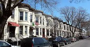 The neighborhood's "brownstone belt" includes homes with brownstone, sandstone, limestone, iron, and ornamental stone-brick facades, though the majority of homes in Sunset Park are faced with brick.[166] Developed mostly between 1892 and 1910 following earlier frame house development, it is dominated by two-story-above-basement, bayed row houses that were envisaged as "inexpensive imitations of the stately four- and five-story townhouses [...] of Brooklyn Heights, Carroll Gardens, Fort Greene and Park Slope."[167] Though their facades were analogous to the less expensive tier of one-family row houses elsewhere in Brooklyn,[lower-alpha 6] most of these structures were in fact built as two-family residences.[50] In addition, several low-rise apartment buildings were erected in the late 19th and early 20th centuries. The row houses and apartment buildings were both intended for the neighborhood's middle-class residents.[33] The two-family row houses came in two types. The cheaper row houses contained an undesignated English basement and one unit on each of the first (or stoop-level) and second floors. More expensive row houses had a subterranean cellar, raised, ground-level basement and first (or parlor) floor as a single triplex unit, and the second floor as another unit.[82]