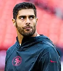 One big reason for the 49ers' success was the emergence of quarterback Jimmy Garoppolo.[22] Garoppolo began his career in 2014 as a backup to New England Patriots quarterback Tom Brady, winning Super Bowls XLIX and LI. After two uneventful seasons, Garoppolo's playing time increased substantially in 2016, due to Brady's suspension and because of several large late-game leads.[23] Garoppolo showed potential, with a 113.3 passer rating over a span of six games.[24] The following season, with San Francisco struggling at 0–8, they traded a second-round draft pick for Garoppolo, who led the 49ers to five straight wins to finish the season.[25] Although he missed most of the 2018 season with a torn anterior cruciate ligament sustained vs. the Chiefs at Arrowhead Stadium, Garoppolo recovered in time for the 2019 season, starting all 16 games.[26]