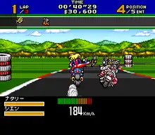 Super Mad Champ is a vehicular combar racing game reminiscent of Road Rash, putting players in control of a motorcycle racer who must finish in either third-place or higher among five racers through three grand prix; GP2, GP1 and Super, with each race taking place in a number of locations.[2][3][4] There are also a time attack option, a password feature and an option screen to configure various settings such as controls and sound.[2]