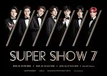 Super Show 7 was the third world concert tour and seventh tour overall by South Korean boy band Super Junior, in support of their eighth studio album, Play. The world tour commenced with three shows in Seoul from December 15 to 17, 2017 and hit a total of 120 concerts for its Super Show series.[1][2]
