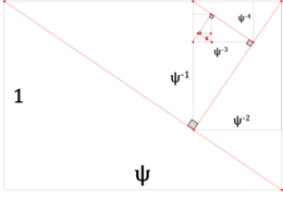 Numbering counter-clockwise starting from the upper right, the resulting first, second and fourth parts are all supergolden rectangles; while the third has aspect ratio . The original rectangle and successively the second, first and fourth parts have diagonal lengths in the ratios or, equivalently, areas . The areas of the diagonally opposite first and third parts are equal.[11][4]