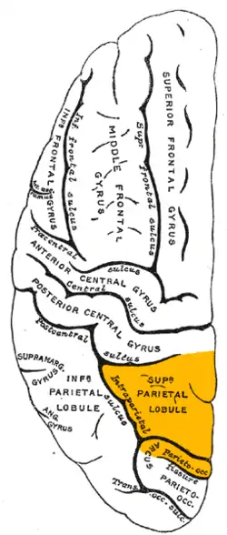 ![]() Lateral surface of left cerebral hemisphere, viewed from above. (Superior parietal lobule is shown in orange.) | |