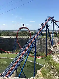 At the time of the ride's announcement, construction had already begun on unused land bordered by quarry walls and an irrigation pond.[5][6] The initial plans for the ride specified it would have seven inversions including a 114-foot-tall (35 m) vertical loop and a 96-foot-tall (29 m) dive loop.[6] Following the ride's announcement, the design was altered to remove the dive loop and increase the size of the vertical loop to 145 feet (44 m).[7][8] This saw Superman: Krypton Coaster obtain the record for the world's tallest vertical loop when it officially opened to the public on March 11, 2000.[7] It held the title for 13 years until the addition of Full Throttle at Six Flags Magic Mountain in 2013.[8]