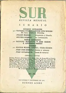 Sur was first published in 1931,[1][2] with the assistance of a multidisciplinary team of collaborators. Its founder and main backer was Victoria Ocampo,[2] and it was supported intellectually by the Spanish philosopher José Ortega y Gasset. Many of the earliest editions of Sur carry the colophon of Ortega's Revista de Occidente. Notable contributors and sometime editors included Jorge Luis Borges, H.A. Murena, Adolfo Bioy Casares and Borges' Spanish brother-in-law Guillermo de Torre.[3] The last issue was published in 1992.[1][4]