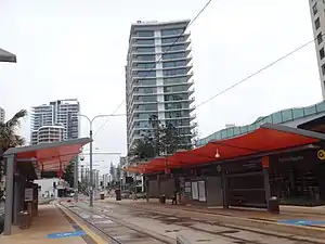 Surfers Paradise light rail station is located on the corner of Clifford St and Surfers Paradise Boulevard.[1] The station is situated centrally of suburb of Surfers Paradise, the key tourist destination in the city of the Gold Coast. Surfers Paradise light rail station is serviced by the city's G:link light rail system that connects Broadbeach South to Helensvale. The station provides direct access to the Q1 residential tower, the tallest residential high rise in the southern hemisphere. The station also provides excellent exposure to numerous hotels and holiday apartments.